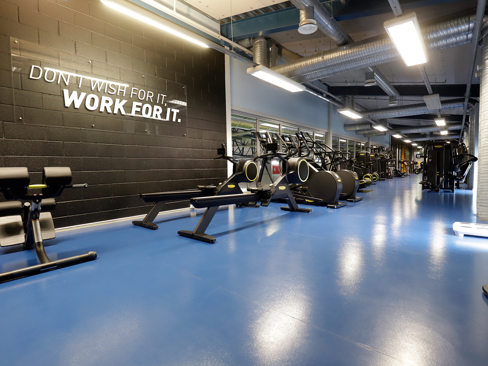 The third-floor gym is equipped with Technogym machines.
